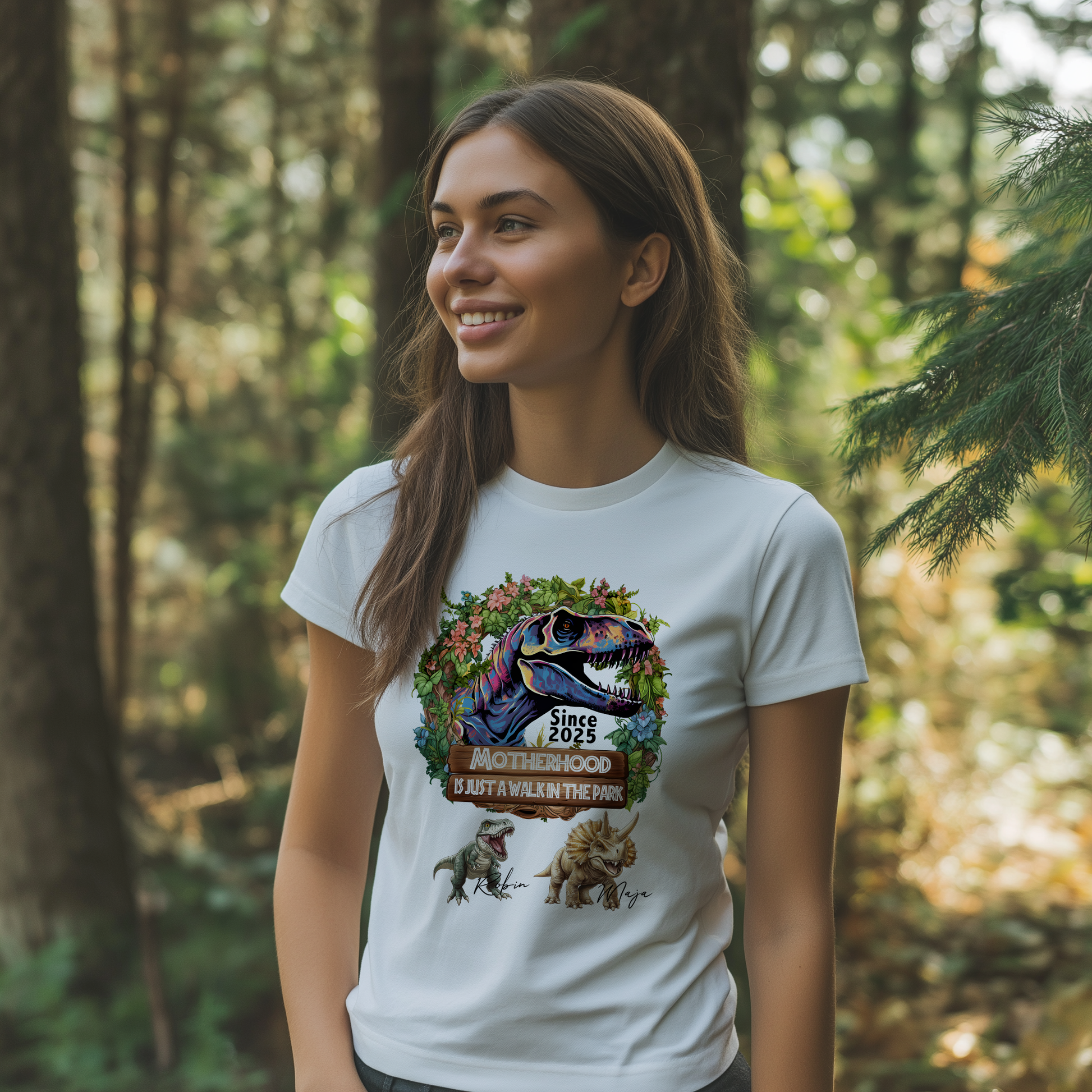 Motherhood is just a walk in the Park mit Jahreszahl und 1-4 Dinokindern